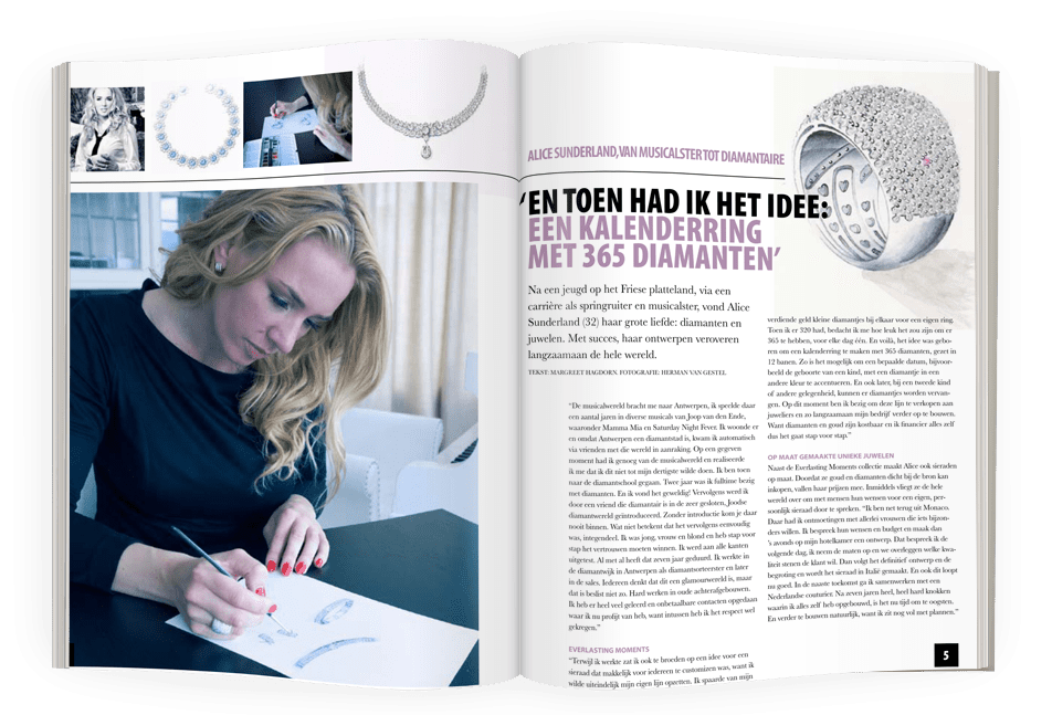Er kwam echter een punt waarop ik een speciaal moment in mijn leven wilde vereeuwigen met mijn ring, als een tastbare herinnering aan een bijzondere gelegenheid. Daarom introduceerde ik een gekleurde diamant die deze specifieke dag symboliseerde in de ring. Dit was het begin van mijn merk, Alice Sunderland, onder het motto 'Everlasting Moments'. Want dat is precies wat mijn juwelen belichamen: eeuwige momenten van betekenis, gevangen in unieke en persoonlijke juwelen.